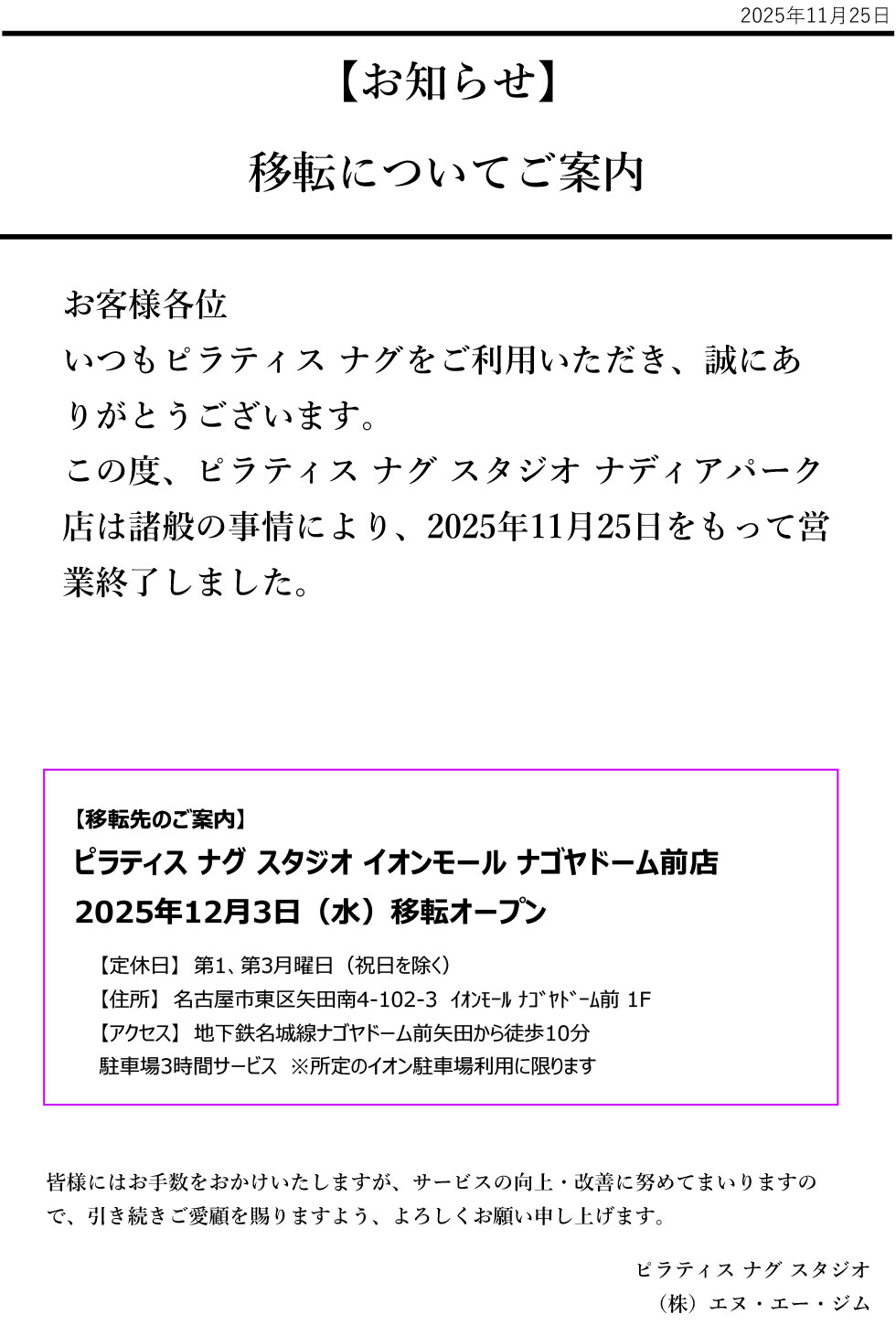 この度、ピラティス ナグ スタジオ ナディアパーク店は諸般の事情により、